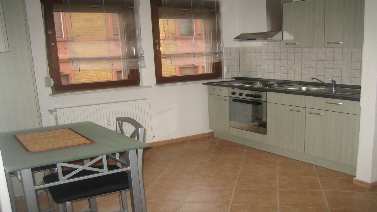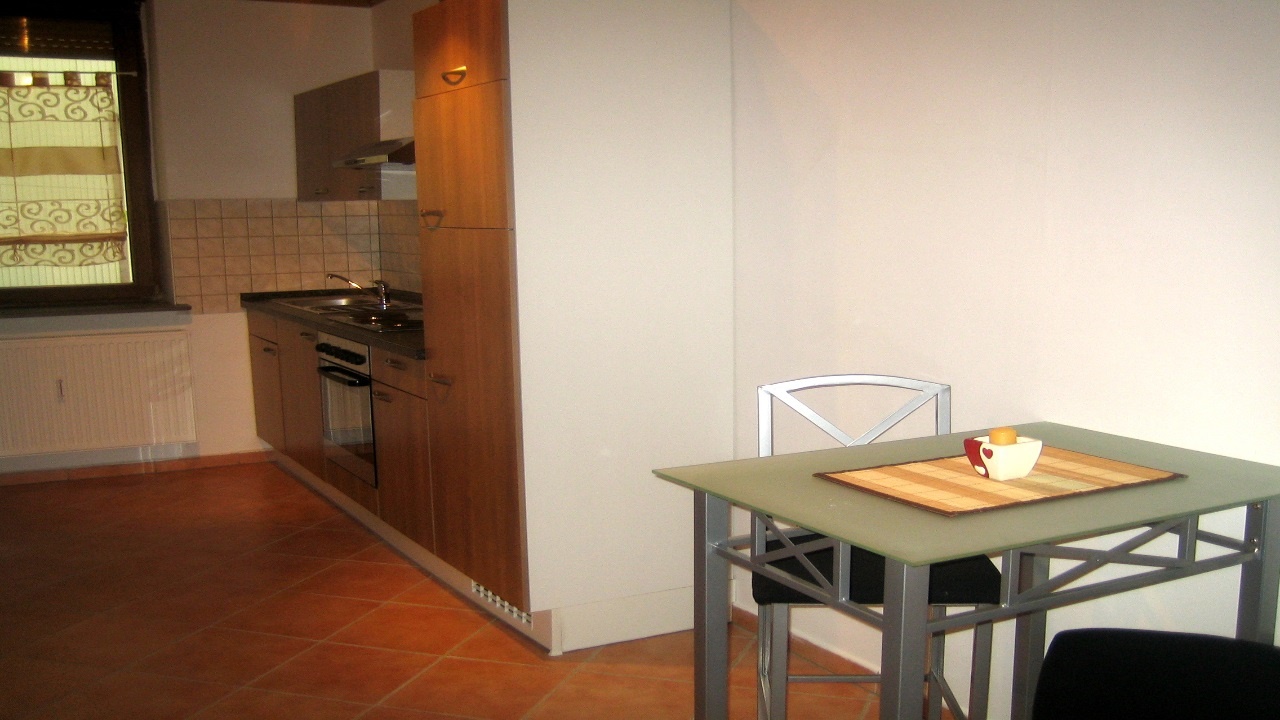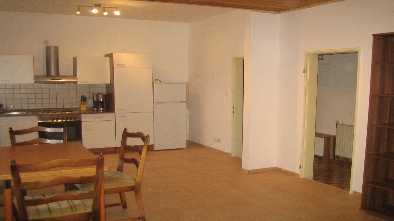 Backoffen, Kochplatte, Dunstabzugshaube, Kühlschrank mit Tiefkühlfach, Mikrowelle, Kaffeemaschine, Wasserkocher, Geschirr, Pfannen, Töpfe und vieles mehr.