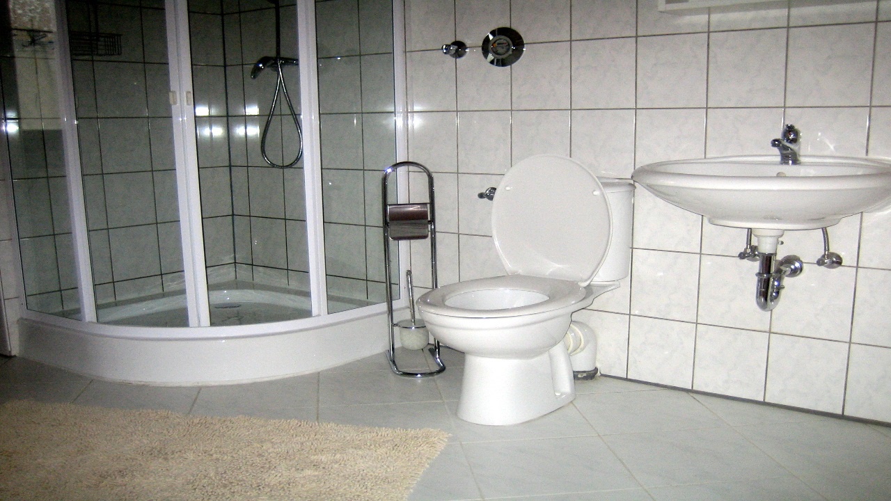 Duschen, Handwaschbecken, WC, Handtuchhalter, Spiegelschrank mit integrierter Steckdose und Wäschespinnen.